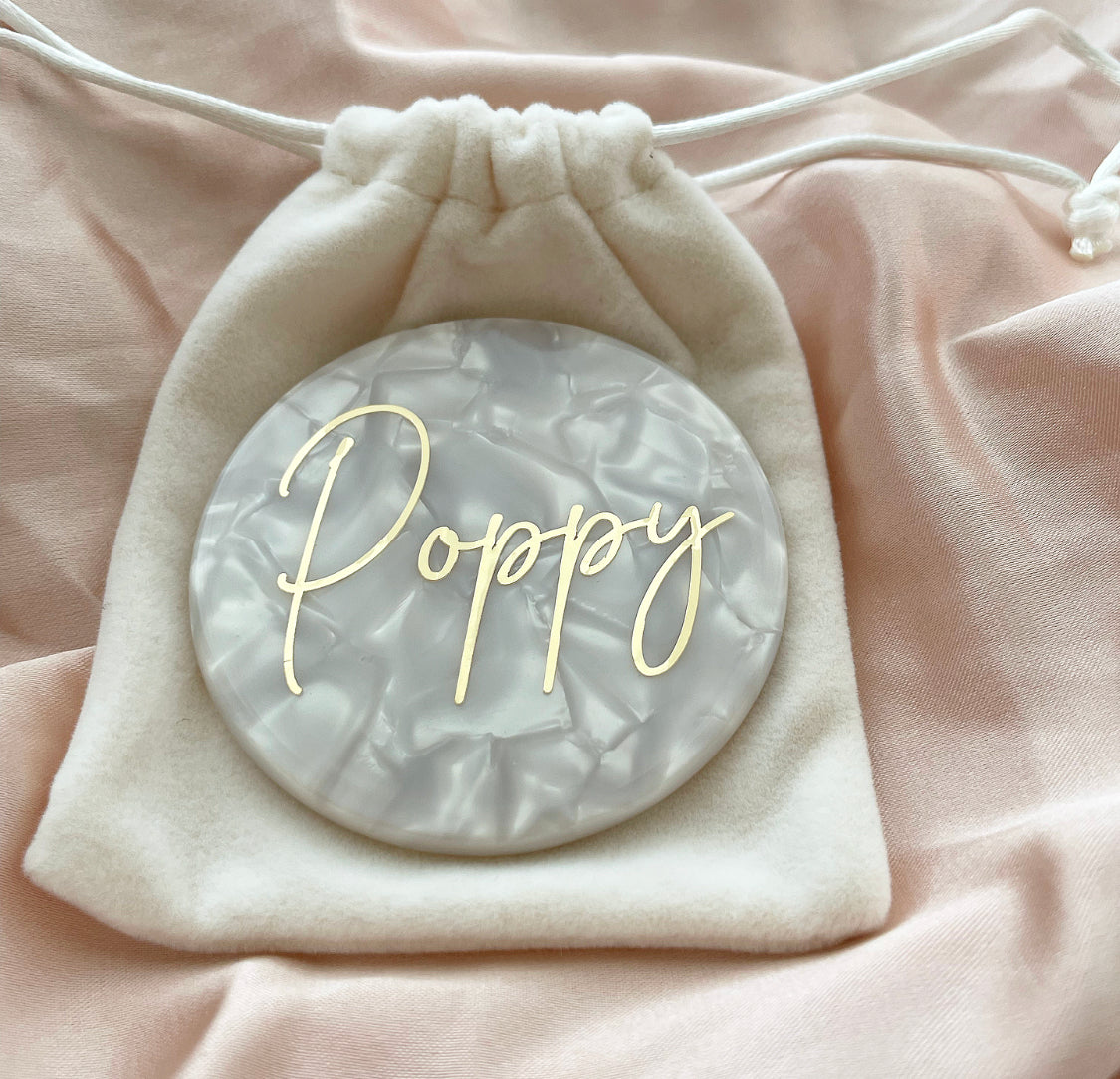 A very compact and pretty personalised mirror that makes a beautiful gift for your loved one or they can be purchased on their own.