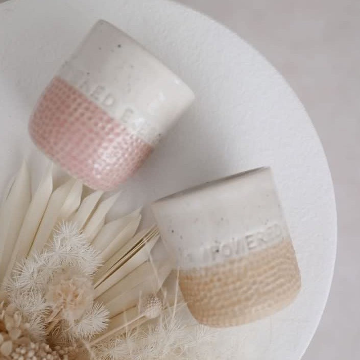 Available in pink or beige with natural oatmeal top - these stunning ceramic mugs measure 9cm x 9cm